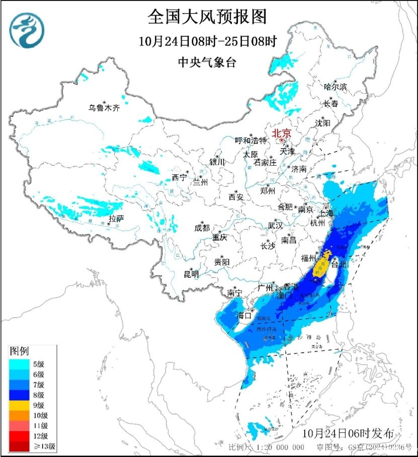 我国东部和南部海域的风力明日减弱。今天,东海大部海域、台湾海峡、台湾以东洋面、巴士海峡、南海北部和中西部海域、北部湾仍有7~8级、阵风9级的大风,其中台湾海峡风力可达9级,阵风10~11级。明天,上述海域的风力将减弱。