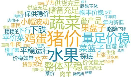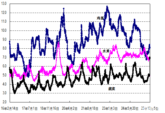 2. 蔬菜均价小幅下跌。重点监测的28种蔬菜周均价每公斤4.97元,环比跌1.2%,同比低21.5%。分品种看,19种蔬菜价格下跌,1种持平,8种上涨。其中,菠菜、菜花和油菜价格环比分别跌8.0%、6.2%和6.1%,其余品种价格跌幅在5%以内;黄瓜价格环比基本持平;莴笋价格环比涨9.4%,其余品种价格涨幅在5%以内。