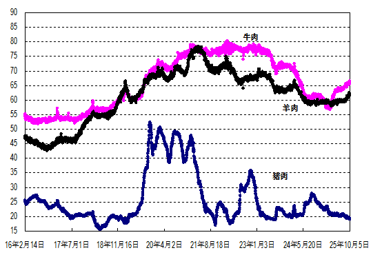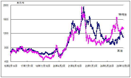 2. 大豆、豆油和棕榈油价格环比基本持平。美国芝加哥商品交易所大豆和豆油最近期货合约收盘周均价每吨分别为372美元和1089美元,环比均基本持平,同比分别低4%和高13%;马来西亚棕榈油荷兰鹿特丹港到岸周均价每吨1350美元,环比基本持平,同比高6%。